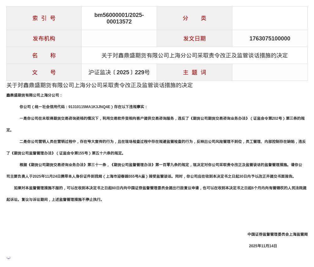 蓝鲸新闻11月26日讯,近日,中国证券监督处分委员会上海监管分局发布了行政监管法子决定书,剑指鑫繁盛期货有限公司上海分公司。