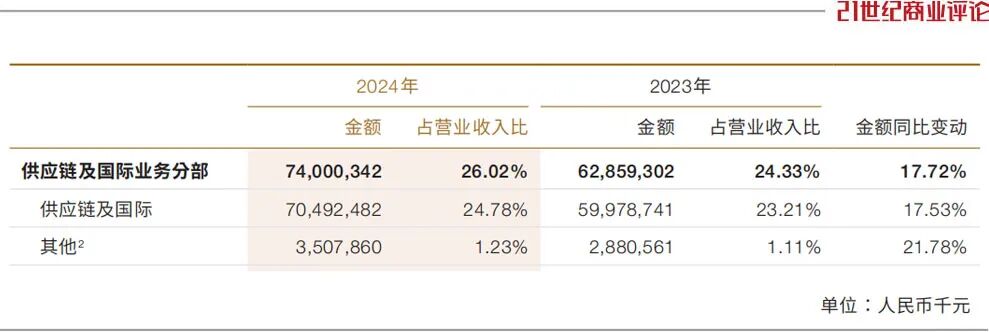 2024年,其供应链及国际业务,收入达到704.9亿元,同比增长17.5%,占营收近三成。