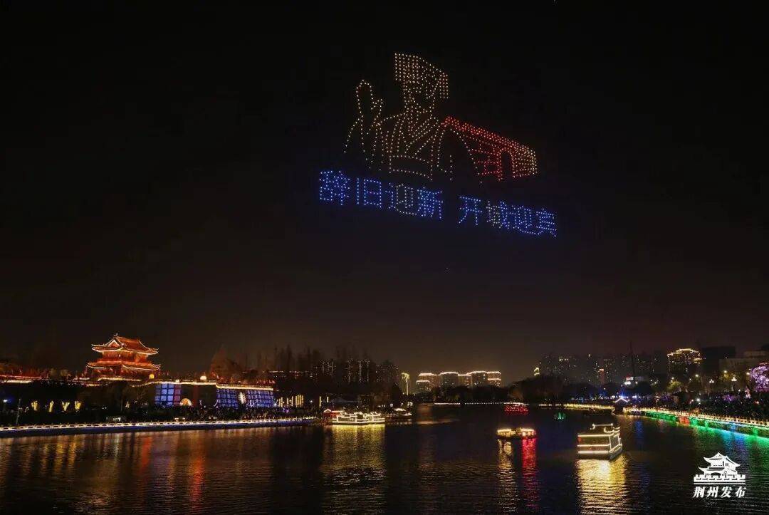 夜幕来临,荆州东门成为科技光影的中枢舞台,千架无东说念主机腾空而起,以天为幕、以城为景。无东说念主机方阵随韵律调遣幻化,宾阳楼的巍峨详细横亘天空,沙市船埠的旧时隆盛在光影中流转,大赛巷的商人烟火暖热铺展……荆州用科技编译光影诗篇。