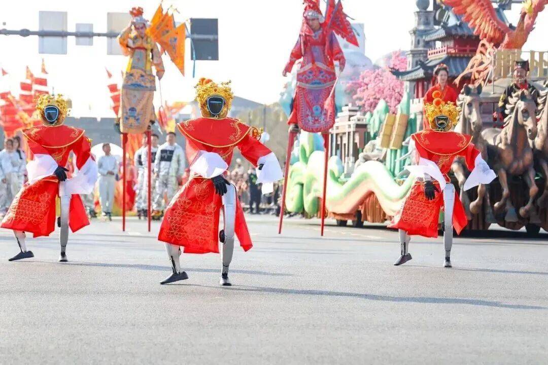 在“荆楚岁时记”年俗巡游中,机器东说念主、机器狗编队惊艳亮相,成为巡游队列中的焦点,它们精确捕捉节拍,活泼作念出贺年、摆尾、腾踊等萌趣算作,憨态可掬的姿首引得孩童追着队列跑跳、伸手互动;