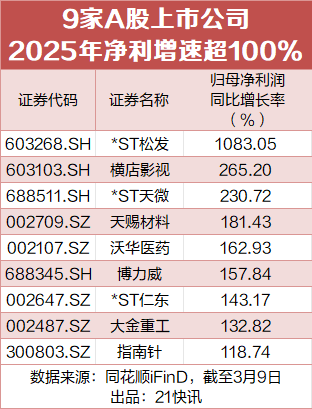 21快讯记者梳剪发现,适度3月9日,包括宁德时期在内,已有54家A股上市公司露出了2025年报。其中已毕归母净利润超2亿元的有25家,归母净利润同比增速超100%的有9家。