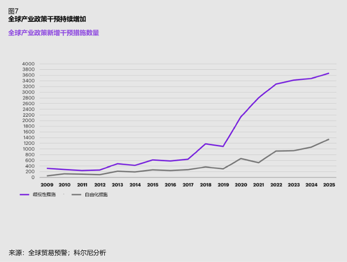 疫情后产业政策膨胀的一个显耀特征,是厌烦性步伐占比显耀高于解放化步伐。厌烦性政策多针对入口商品与外资企业,易恶化外商营商环境;而解放化政策旨在扩打绽开、裁减贸易壁垒。2025年,73%的新增产业政策干扰属于厌烦性步伐,反馈出列国政策态度更趋防范。