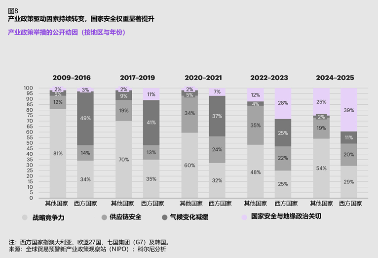 新产业政策不雅察站(New Industrial Policy Observatory)数据自大,政策制定中的安全考量日益杰出。2024年—2025年,西方国度39%的产业政策以国度安全与地缘政事为事理,较2009年—2016年大幅提高36个百分点;其他国度中,25%以国度安全为由,54%以提高计谋竞争力为由。